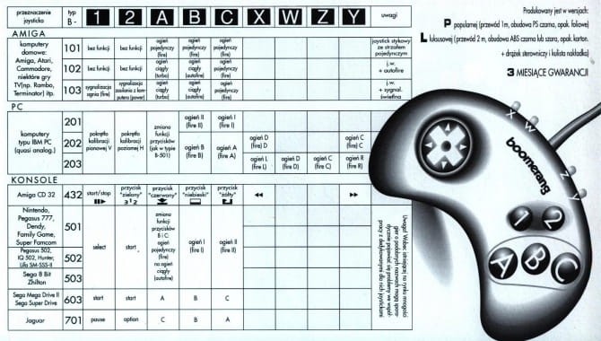 Joypad "BOOMERANG" B101 na stykach gumowych (z gumy przewodzącej prąd - jak w kalkulatorach) bez autofire. Joypad "BOOMERANG" B101P przeznaczony do komputerów domowych typu Amiga (np. 500, 600, 1200), Atari (np. 65XE, 130XE, 130ST), Commodore (np. C64) oraz niektórych konsoli - np.typu Atari 2600.