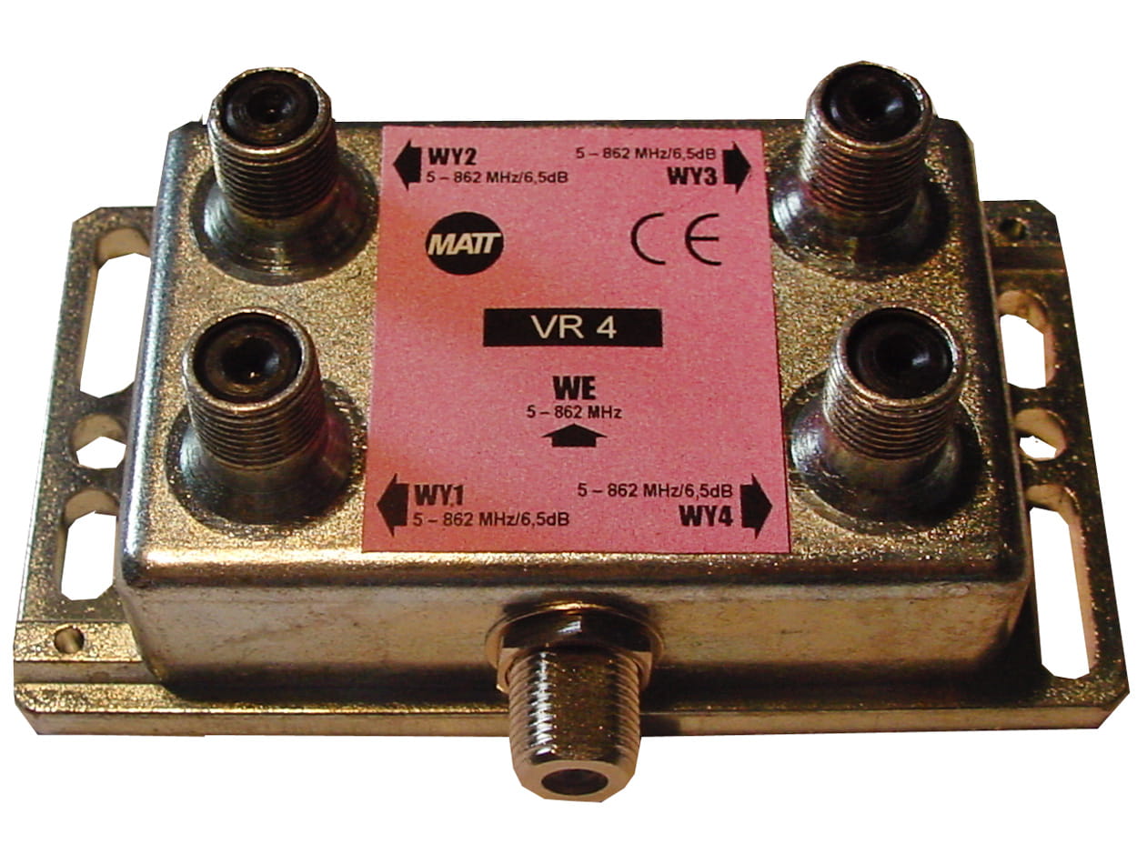 Rozgałęźnik czterokrotny VR 4 przeznaczony zarówno do sieci CATV, jak i małych instalacji indywidualnych. W wykonaniu standardowym posiada blokadę napięcia zasilającego na wejściu do 500VDC.