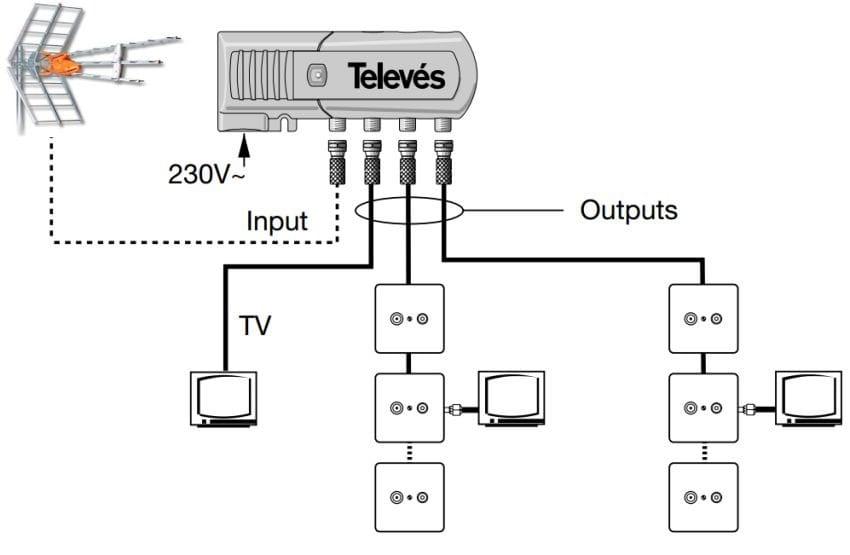 Wysokiej klasy wewnętrzny wzmacniacz domowy DVB-T marki Televes 552220. Urządzenie wyposażono w 2 wyjścia do rozdziału i dodatkowe 3 wyjście do bezpośredniego podłączenia telewizora tak zwane wyjście testowe bez wzmocnienia. Istnieje możliwość dodatkowego podzielenia sygnału na większą ilość odbiorców poprzez zastosowanie rozgałęźnika (dostępne w naszej ofercie).